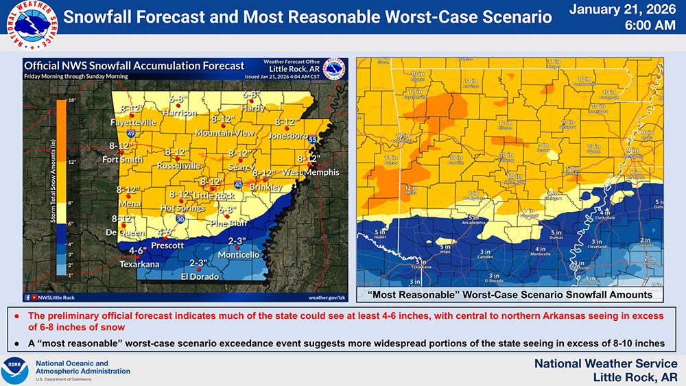 As winter weather grips parts of the Midwest, the National Weather Service (NWS) office in Little Rock has issued a forecast predicting that frozen precipitation will begin affecting the region, including campuses of Arkansas Tech University (ATU) in Russellville and Ozark, on the afternoon or early evening of Friday, January 23. The anticipated weather event is expected to bring not only snow and ice but also dangerously cold temperatures that could reach single digits.
