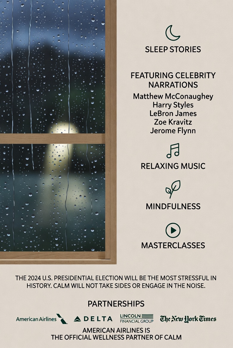 A standout moment occurred during the 2024 U.S. presidential election coverage, when Calm aired 30-second ads filled with silence, accompanied only by the text, "We've bought this ad space to give you 30 seconds of silence." This resonated deeply with viewers amid the chaos of debates and results, sparking conversations about stress relief. The ads became viral, fitting seamlessly with Calm's brand message and turning a high-tension moment into an opportunity for calm.